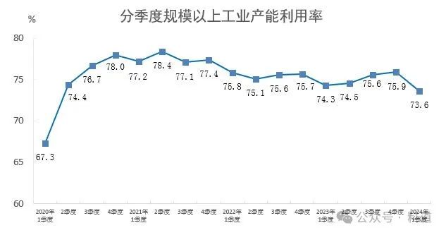 2024年一季度,全国规模以上工业产能利用率为73.6%,比上年同期下降0.7个百分点,比上季度下降2.3个百分点。