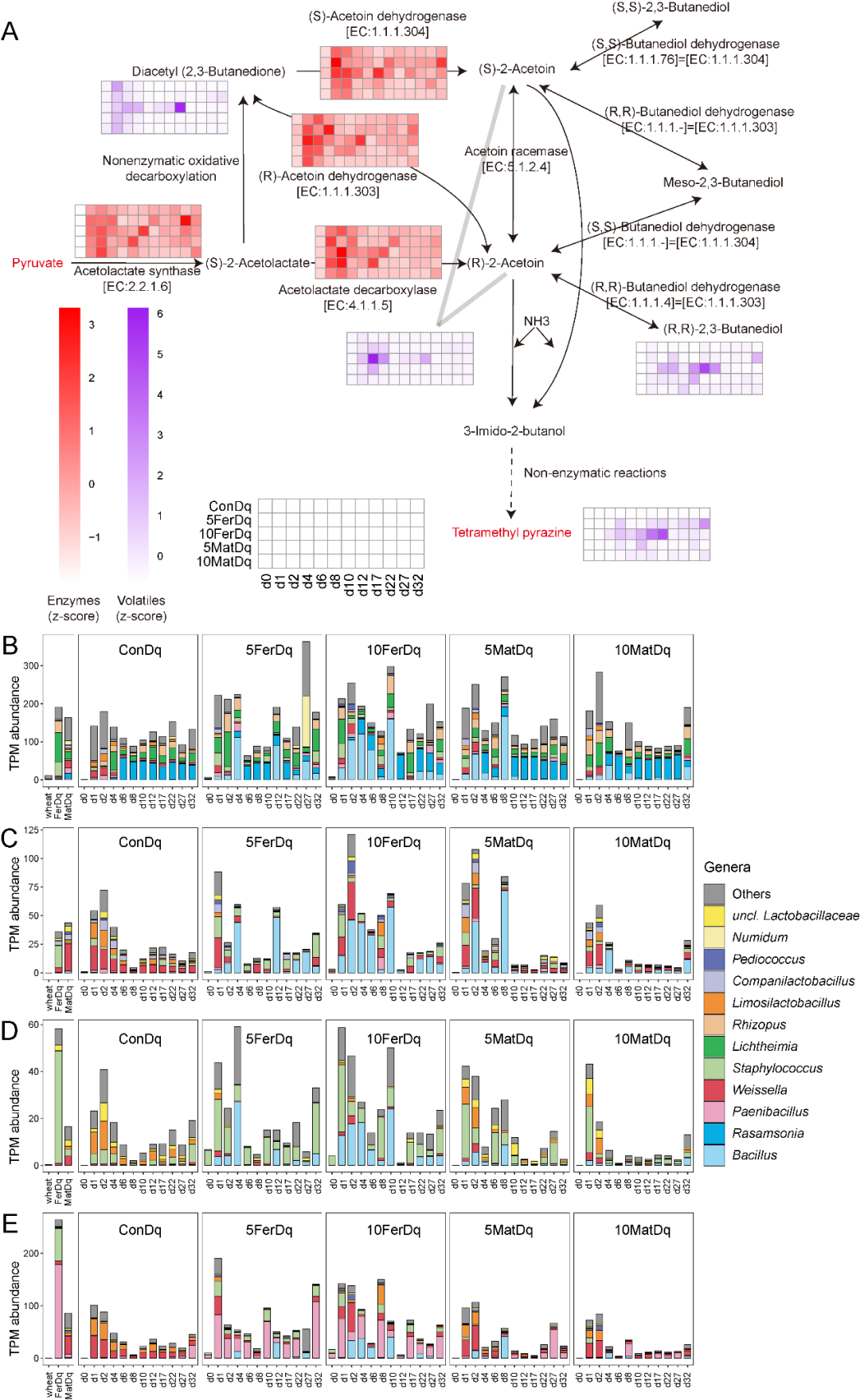 四甲基吡嗪合成代谢途径中,宏基因组结果显示,芽孢杆菌属、葡萄球菌属和类芽孢杆菌属(Paenibacillus)有利于吡嗪类化合物的生物合成,FerDq两组中这些微生物相对丰度较高,促进其吡嗪类化合物的大量积累。同样地,MatDq两组也能提升大曲吡嗪类物质含量,但其效果弱于FerDq。