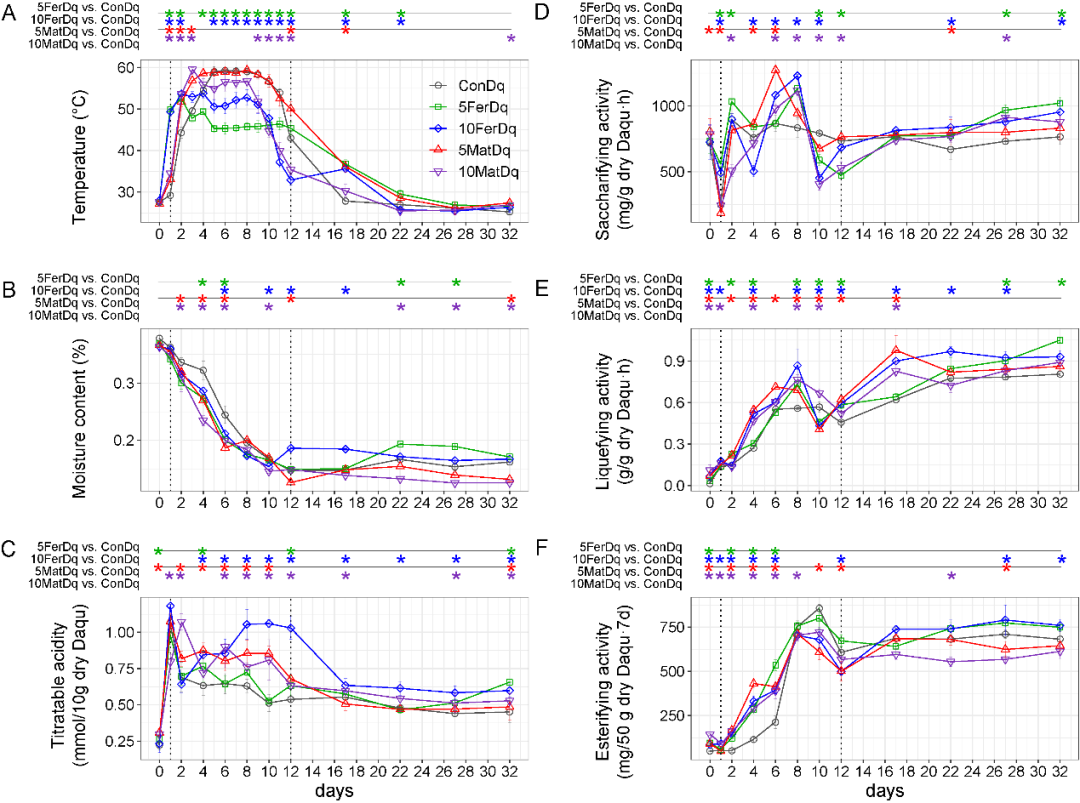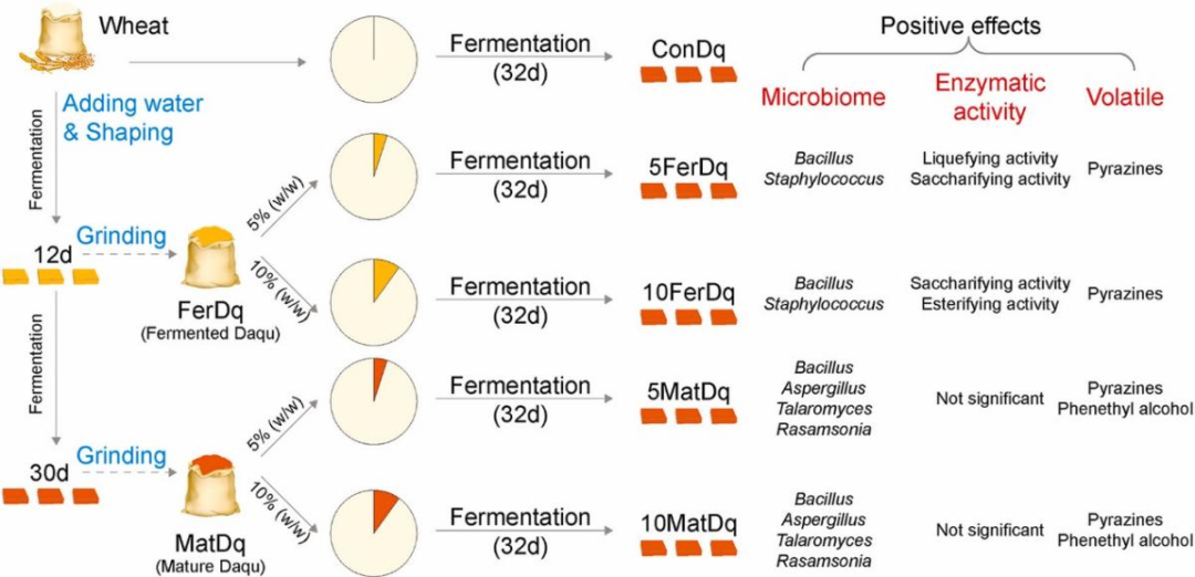 本研究选择正常发酵12天大曲(FerDq)和30天大曲(MatDq)作为母曲,分别以5%(w/w)和10%(w/w)的接种比例开展强化试验,并同时设置对照组(ConDq)。