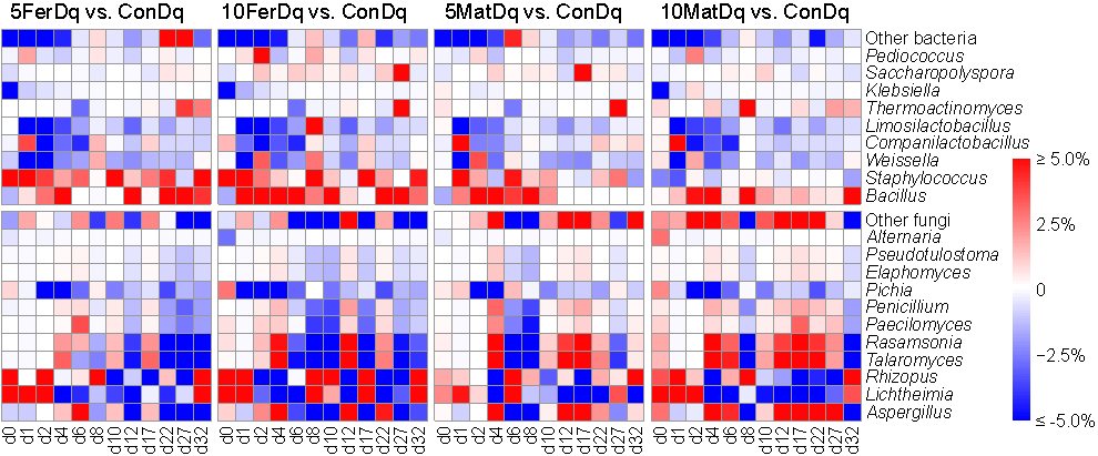 群落水平强化均可提高大曲中芽孢杆菌属相对丰度。此外,FerDq两组还可提高葡萄球菌属相对丰度;MatDq两组则可提高大曲发酵10–32天期间曲霉属(Aspergillus)、篮状菌属(Talaromyces)和罗萨氏菌属(Rasamsonia)的相对丰度。