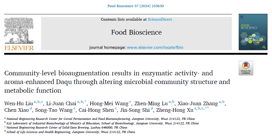 近日,江南大学生物工程学院许正宏教授(现为四川大学教授)团队联合泸州老窖国家固态酿造工程技术研究中心沈才洪主任团队在国际食品科技专业TOP期刊《Food Bioscience》上(JCR Q1)发表了题为“Community-level bioaugmentation results in enzymatic activity- and aroma-enhanced Daqu through altering microbial community structure and metabolic function”的研究论文,即“宏基因组学揭示群落水平强化提升中温大曲酶活和香气的机制”。泸州老窖青年员工、双方联合培养博士研究生刘文虎为论文第一作者。