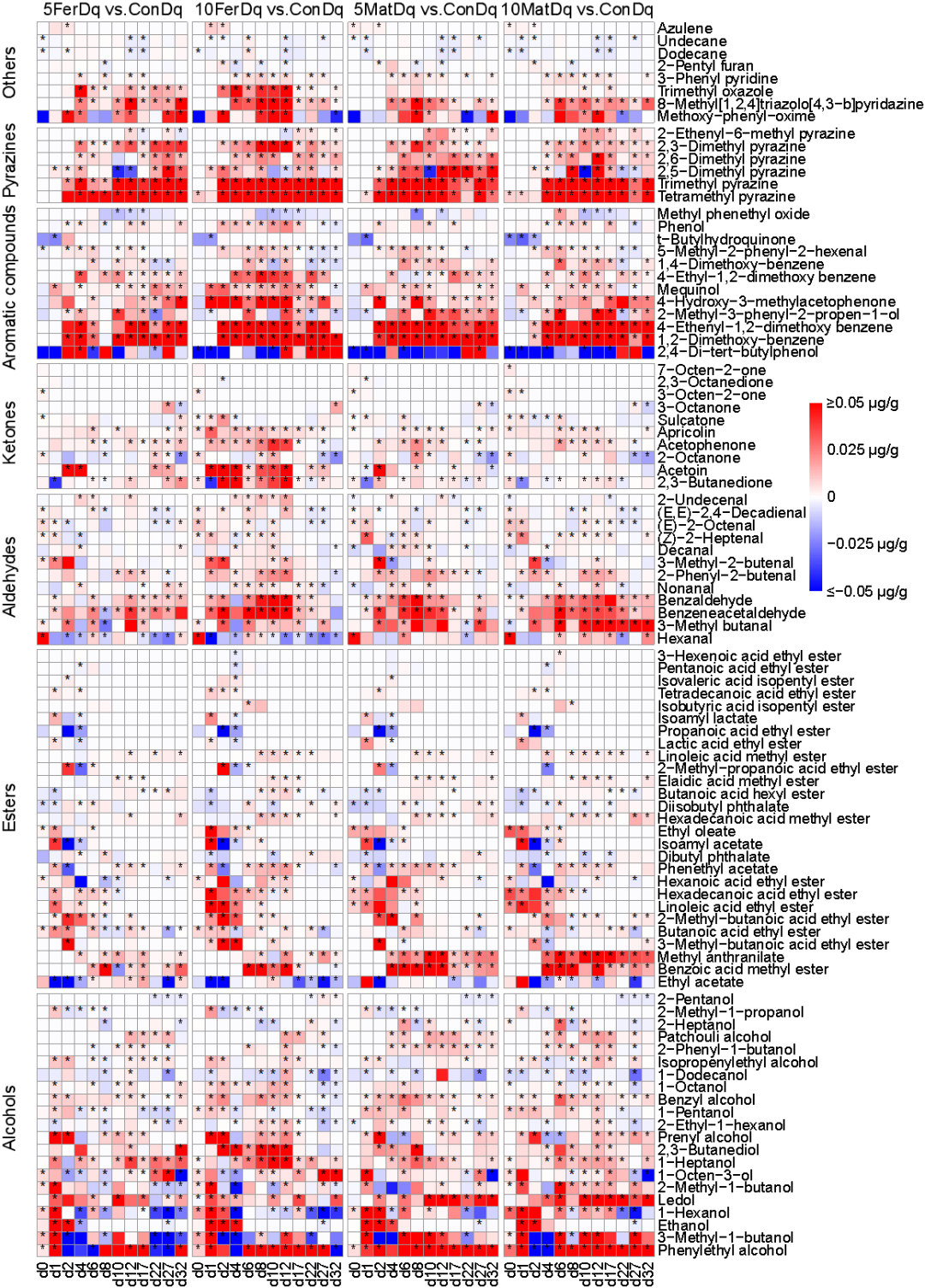 强化能促进大曲中挥发性风味化合物的积累,特别是醇类(如苯乙醇,5FerDq发酵32天提升89.0%,10FerDq降低50.7%,MatDq两组平均提升137.8%)和吡嗪类(如四甲基吡嗪,FerDq两组发酵32天平均提升96.5倍,MatDq两组平均提升17.7倍)。另外,MatDq两组能显著提高发酵4天以后的苯甲酸甲酯和邻氨基苯甲酸甲酯含量。