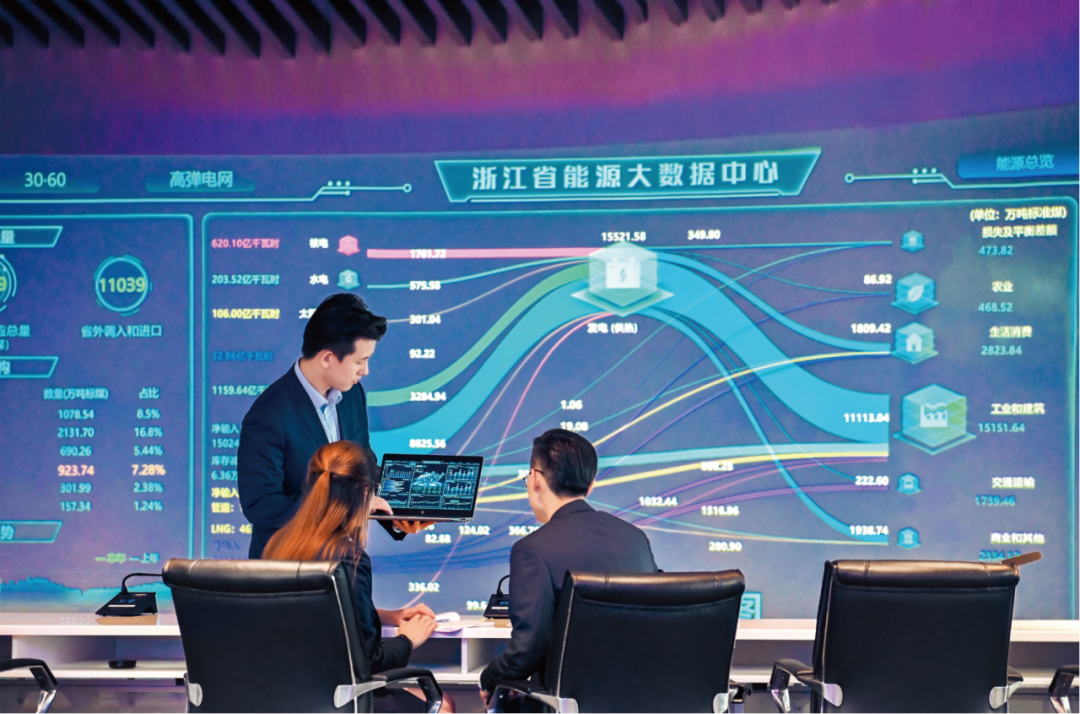 ▲国网浙江电力员工在能源大数据中心对一季度用电情况进行分析诊断