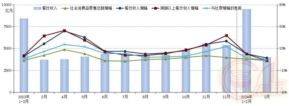中国烹饪协会分析,一季度全国餐饮收入增速、限额以上餐饮收入增速分别较上年同期下降3.1个百分点、9.1个百分点。全国餐饮收入占到社会消费品零售总额的11.2%,高于社会消费品零售总额增幅6.1个百分点。