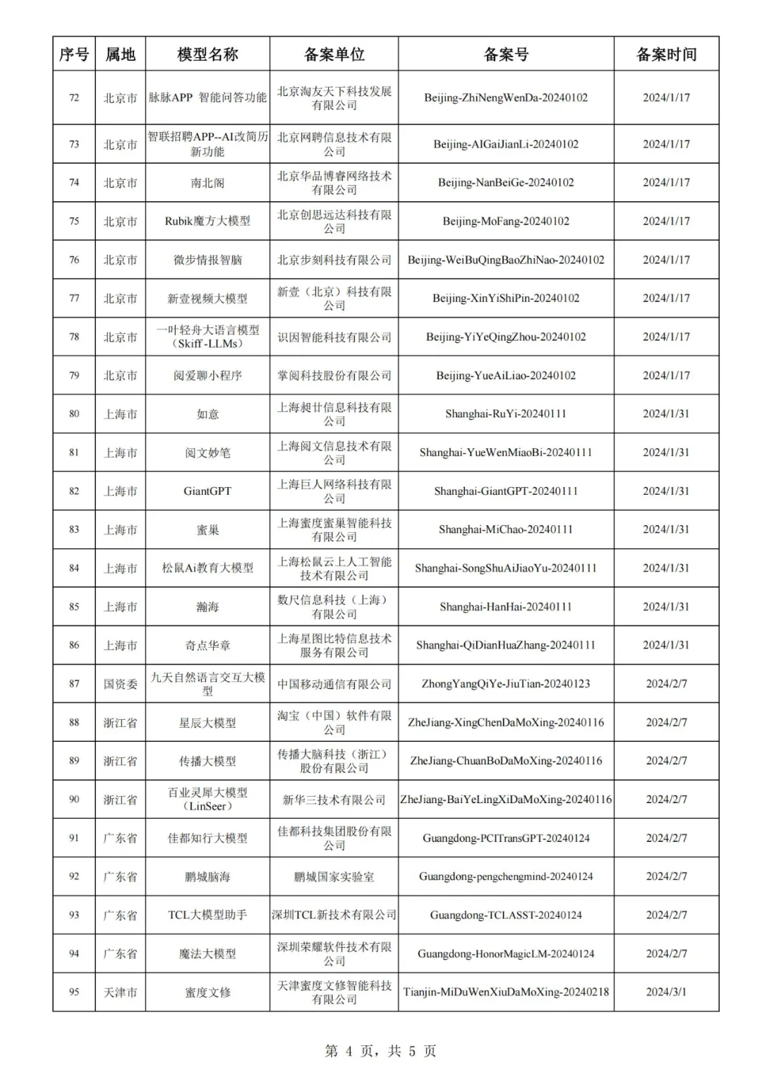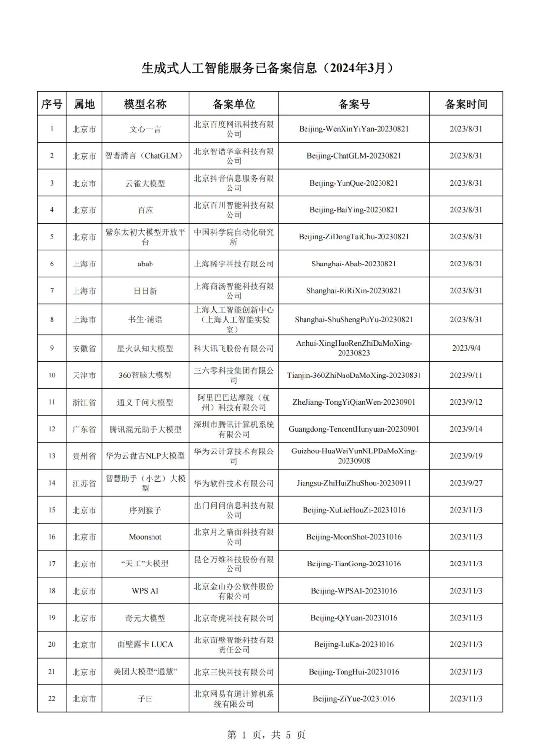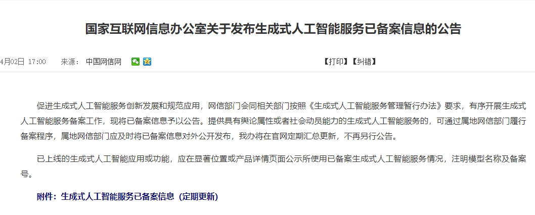 4月2日,国家互联网信息办公室公布最新的生成式人工智能备案信息。
