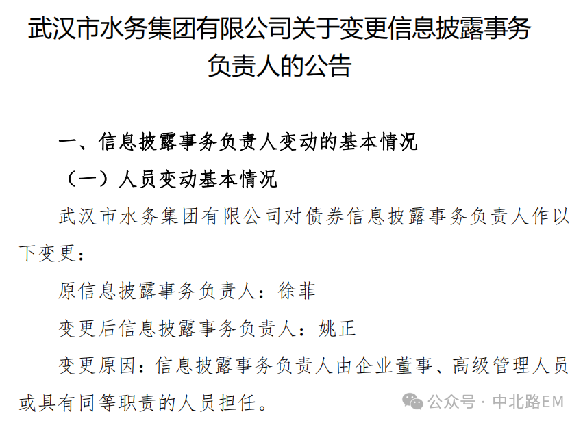 微信公众号中北路获悉,武汉企业:武汉市水务集团有限公司关于变更信息披露事务负责人的公告节选。