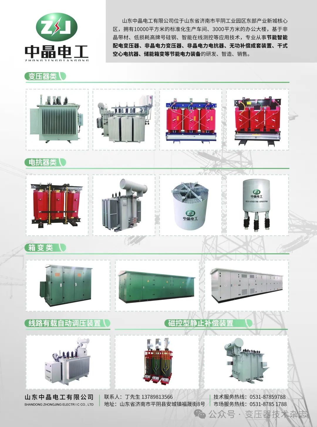 山东中晶电工有限公司位于山东省济南市平阴工业园区东部产业新城核心区,拥有 10000平方米的标准化生产车间、3000 平方米的办公大楼,基于非晶带材、低损耗高牌号硅钢、智能在线测控等应用技术,专业从事节能智能配电变压器、非晶电力变压器、非晶电力电抗器、无功补偿成套装置、干式空心电抗器、储能箱变等节能电力装备的研发、智造、销售。