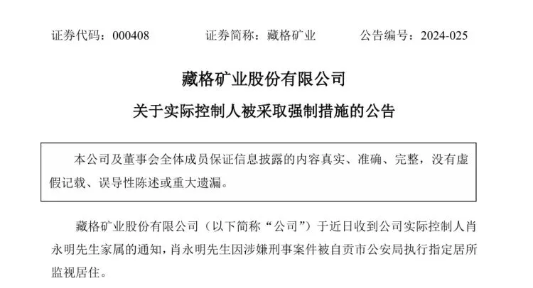 2024年4月15日晚间,藏格矿业发布公告称,公司于近日收到公司实际控制人肖永明家属的通知,肖永明因涉嫌刑事案件被自贡市公安局执行指定居所监视居住。