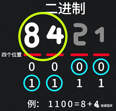 同理,8421四个位置,只要对应位置为1,就表示该位置有效,例如上图的1100,前面的两个1,分别表示了8和4有效,而后面的两个0就表示2和1无效,最终就可以得出二进制数1100表示了十进制数的12(8+4)。看到这里,你明白了吗?明白了的话,问个小问题,二进制数1010表示十进制数的多少?评论区告诉我吧。(答案:8+2=10)