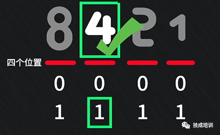 简单,让这个位置变成1。由于是二进制数,所以四个位置上,只能坐1或0,若为1,就表示该位置上对应的数字有效,若为0,则表示该位置上的数无效,等于0。例如下图所示,想要4有效,就让4对应位置变成1,此时就是0100,也就是说,0100这个二进制码就表示了十进制数的4。