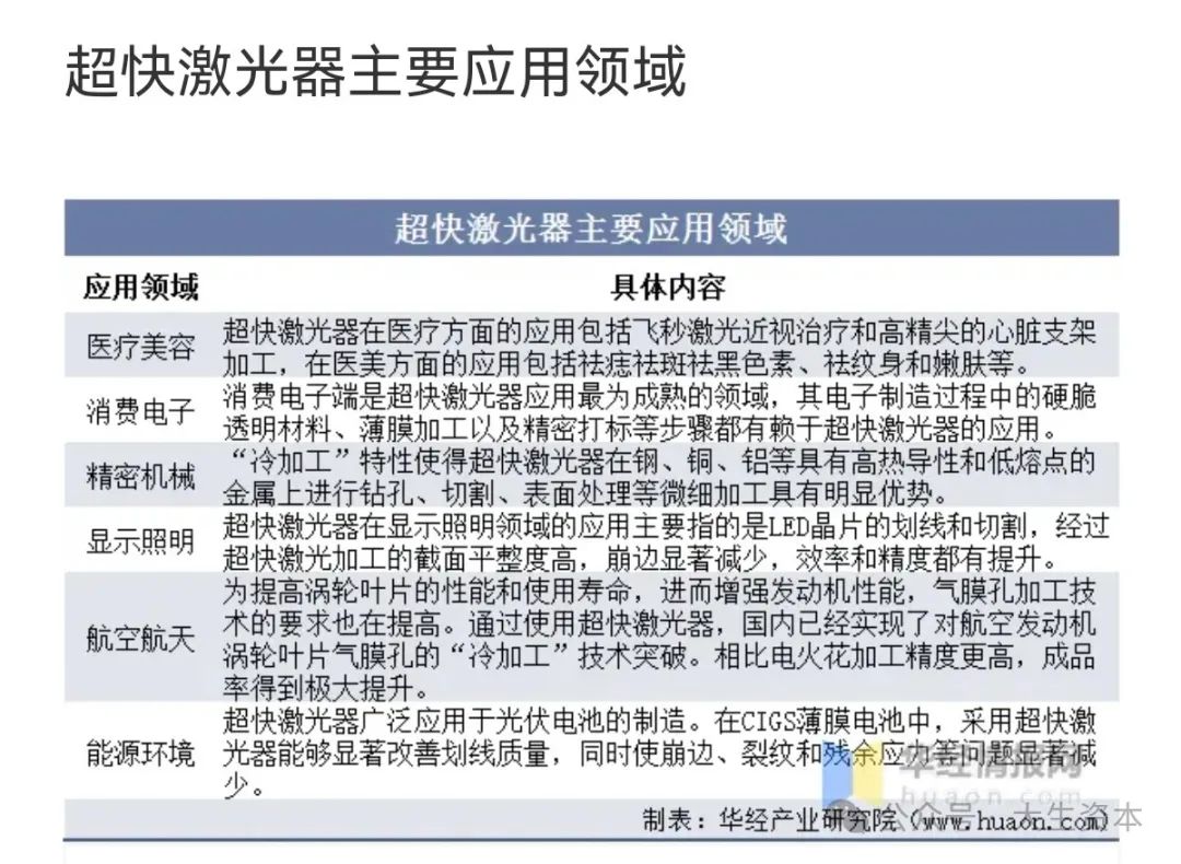 随着超快激光器的技术发展以及持续的市场渗透,未来有望在医学美容、消费电子、精密器械、显示照明、航空航天和能源环境等行业得到进一步普及。