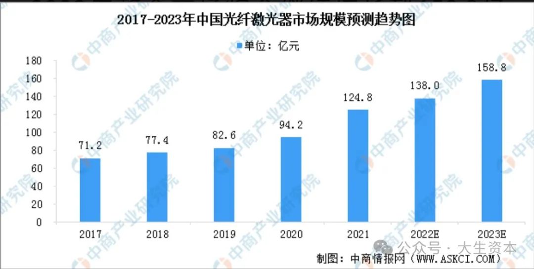 中商产业研究院预测,2023年中国光纤激光器市场规模将达135.5亿元,同比增长超过10%。根据2023年超快光纤激光器行业市场发展格局分析报告,2022年全球超快光纤激光器市场规模达100亿元,中国超快光纤激光器市场规模达50亿元,预计到2028年全球超快光纤激光器市场规模将达到200亿元,年复合增长率预估为14%。