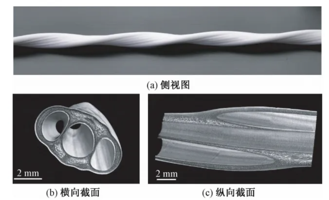 纤维是用来制造纺织服装的基本单元,纤维选择对于纺织服装的功能、属性和质量尤的为重要。使用3D打印技术制造可行的纺织纤维,重点考虑在旋转、拉伸和热定型等加工过程中形成所需的纤维结构。目前,3D打印技术制造的纤维结构大多模拟纺织纤维形态,包括纤维的纵向和横截面的形态,每种形态都会赋予纤维独特的特性。Luelf等提出了一种通过液体绳索线圈效应制造圆形卷曲中空纤维的方法,并利用3D打印技术制造了具有轴向正弦形且径向圆形的中空纤维。