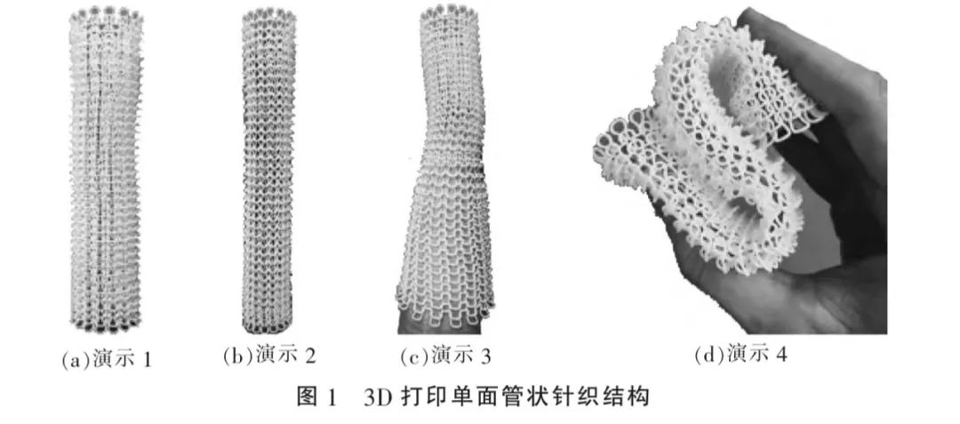 模仿纺织织物组织结构是 3D打印的一种制柔方式,采用不同的打印技术和打印材料,从三维空间的角度制造梭织面料或针织面料,来改善 3D 打印服装过硬的缺陷。3D 打印织物结构不仅在平面组织进行了大量探索,有研究者通过模拟连环结构,采用 SLS 技术把锦纶粉末烧结成管状单面和双面针织结构,打印的管状针织结构可以很容易地压缩、扩展、拉伸和折叠,以此提升 3D 打印织物的柔韧性和舒适性。
