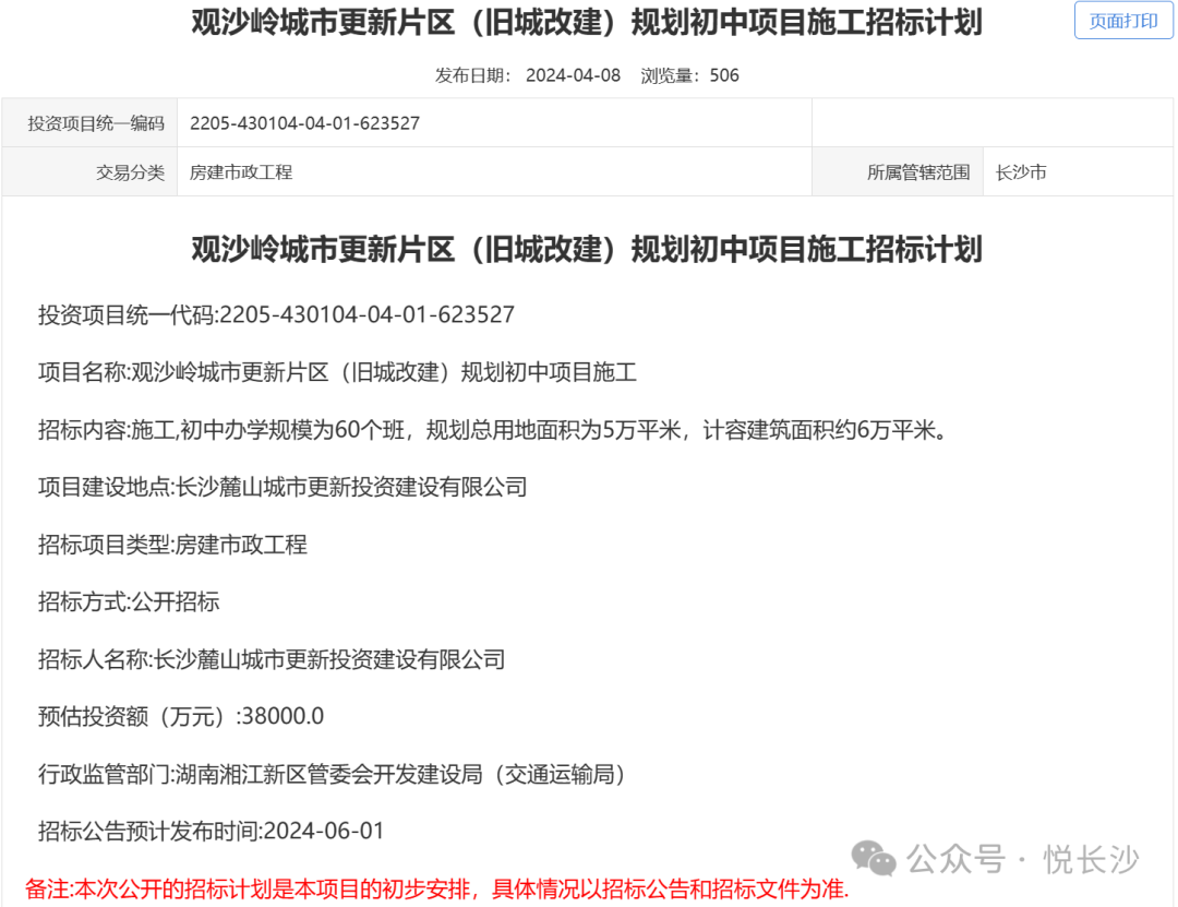 ,观沙岭城市更新片区(旧城改建)规划初中项目施工招标计划。