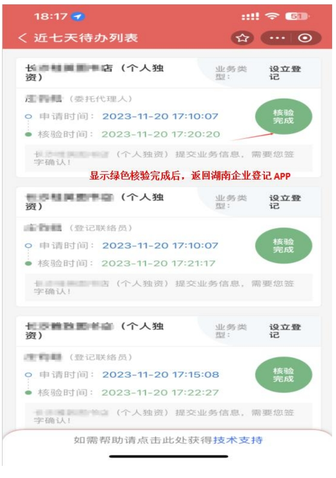 第十四步:显示绿色核验完成后,返回湖南企业登记APP