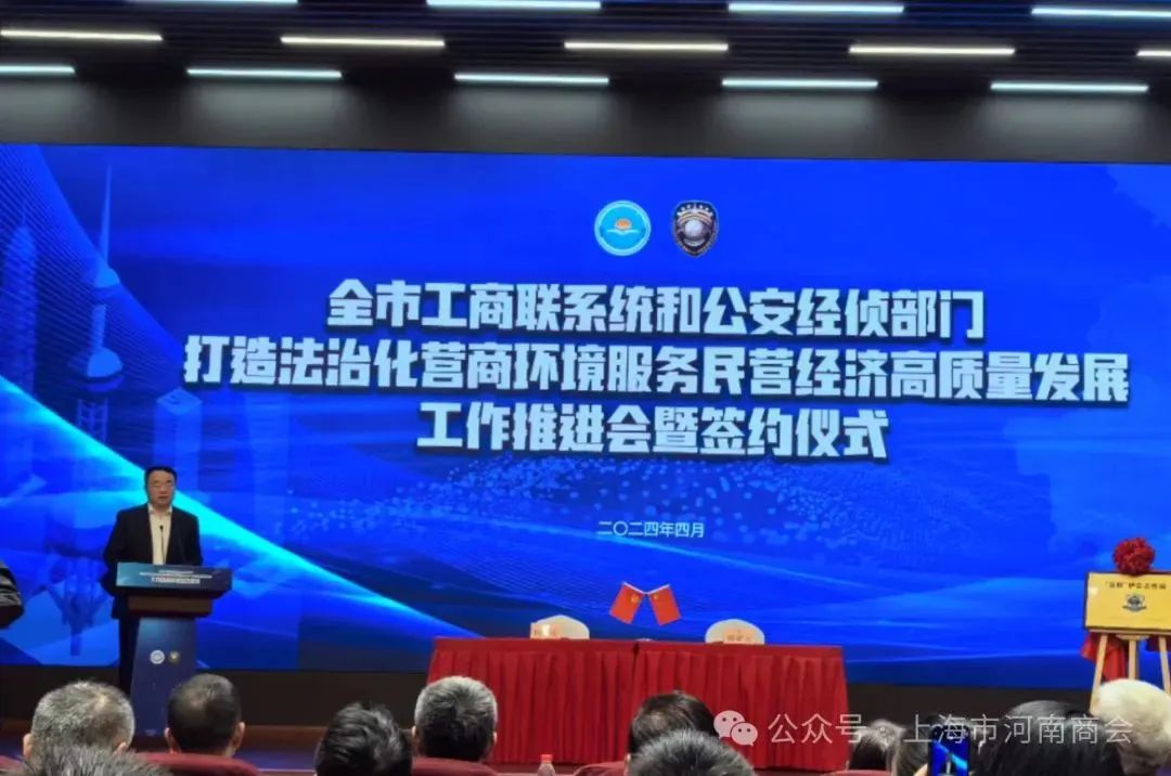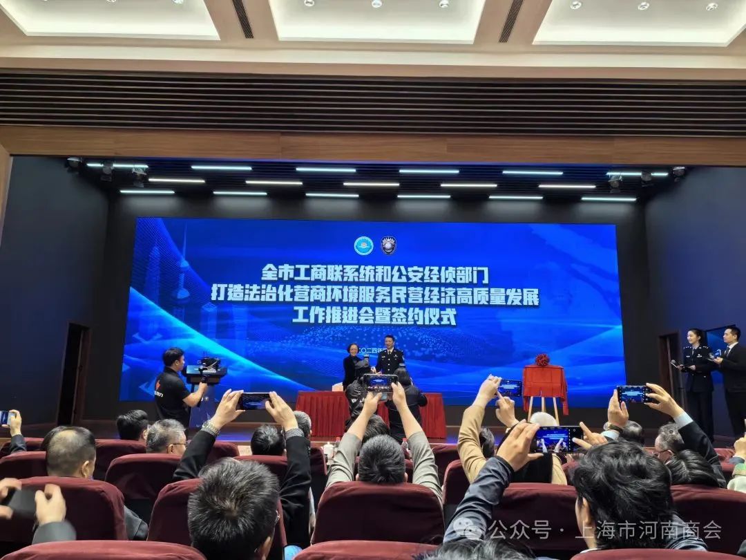 2024年4月13日,“全市工商联系统和公安经侦部门打造法治化营商环境服务民营经济高质量发展工作推进会暨签约仪式”在虹口区上海市公安局经侦总队综合楼召开。出席的领导嘉宾有:上海市委统战部副部长、市工商联党组书记王霄汉,市工商联副主席杨茜,上海市公安局副局长罗震川,市公安局经侦总队长胡斌勇,市工商联商协会工作委员会成员单位的负责人等。商会应邀参加了本次会议。
