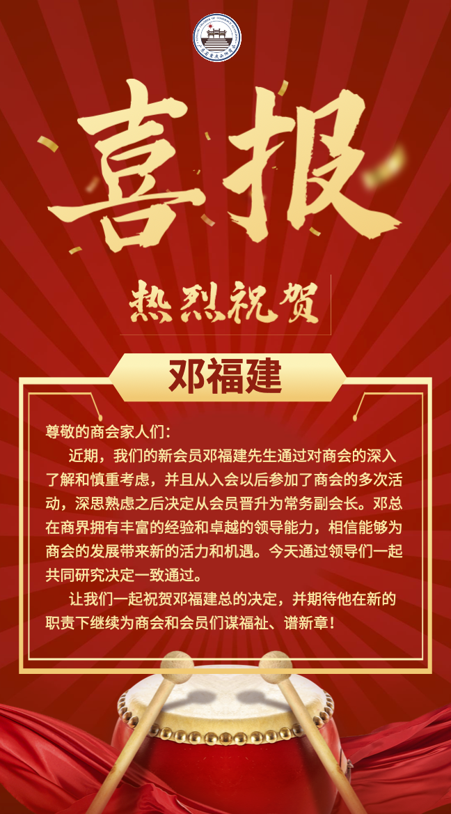 喜报:祝贺邓福建邓总晋升为商会常务副会长