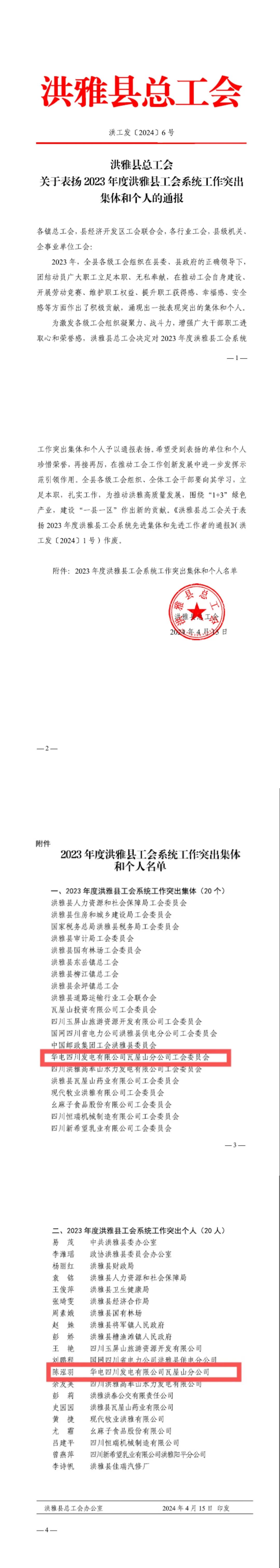 热烈祝贺公司工会获洪雅县总工会嘉奖
