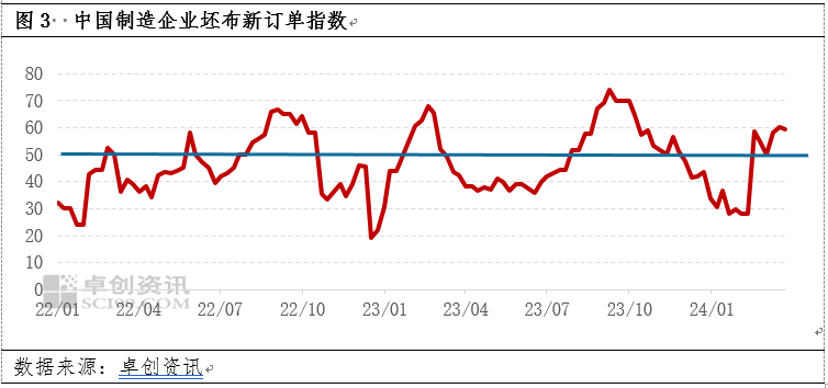 备注:终端织造企业坯布新订单指数以50为荣枯线,新订单指数高于50,行业终端订单较好,进而反馈至上游原料端,再生聚酯的出货较为通畅;反之,新订单指数低于50,行业需求不佳,订单匮乏,进而导致原料端的销售压力上涨。