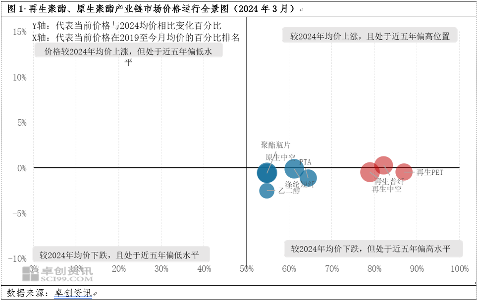 3月再生聚酯及原生聚酯较2024年均价微幅波动,但处于近五年的偏高水平