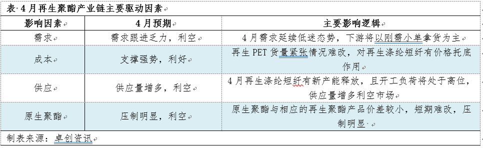 再生PET货量紧张,为再生涤纶短纤价格托底。4月份天气回温,毛瓶回收量将有增多,但幅度有限,再生PET行业供应紧张局面难改,且清洗厂利润收窄,低价惜售心态趋浓,对再生涤纶短纤价格将有托底作用。