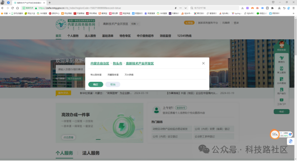 第一步:在网站上搜索“内蒙古政务服务网”或复制链接“https://zwfw.nmg.gov.cn”,登录后选择包头市—高新技术产业开发区。