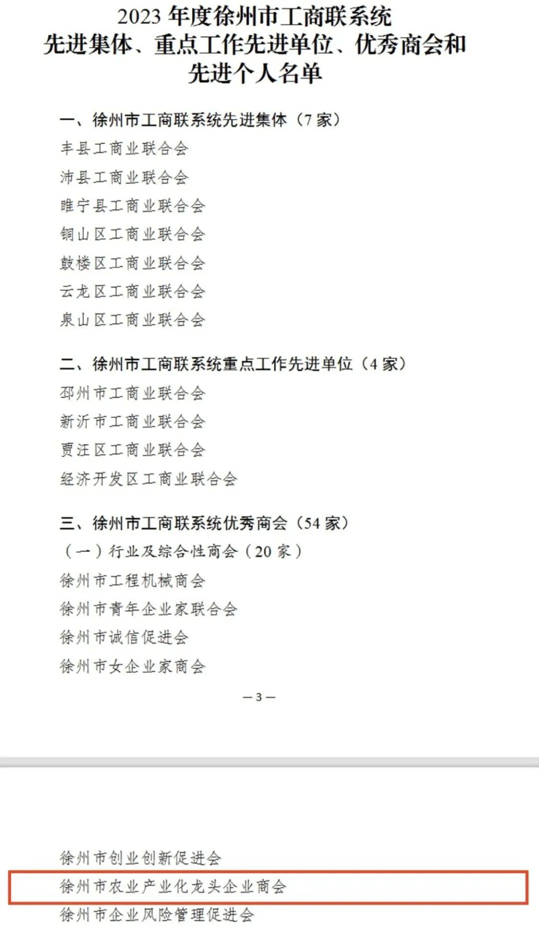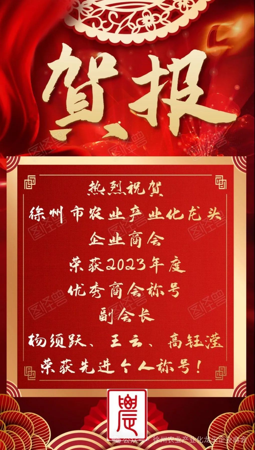 近日,徐州市农业产业化龙头企业商会传来喜讯,商会荣获2023年度优秀商会称号,副会长杨须跃、王云、高钰莹获评先进个人。这一荣誉的获得,不仅是对商会长期以来在推动农业产业化发展方面所做努力的肯定,也是对商会全体成员辛勤付出的认可。