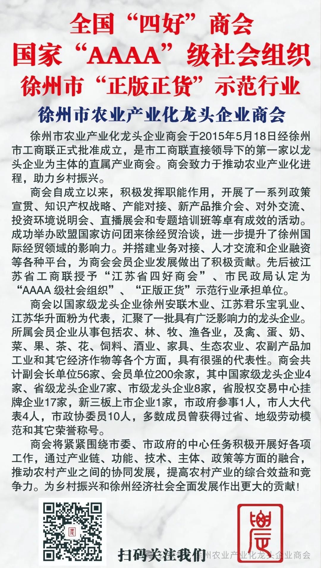 未来,徐州市农业产业化龙头企业商会将继续秉承“服务会员、推动发展”的宗旨,通过搭建交流合作平台、推动资源共享、反映企业需求、加强行业自律等方式,为会员企业提供更有力的支持和帮助。商会相信,在全体会员的共同努力下,一定能够取得更加辉煌的成绩,为当地农业产业的繁荣做出更大的贡献。