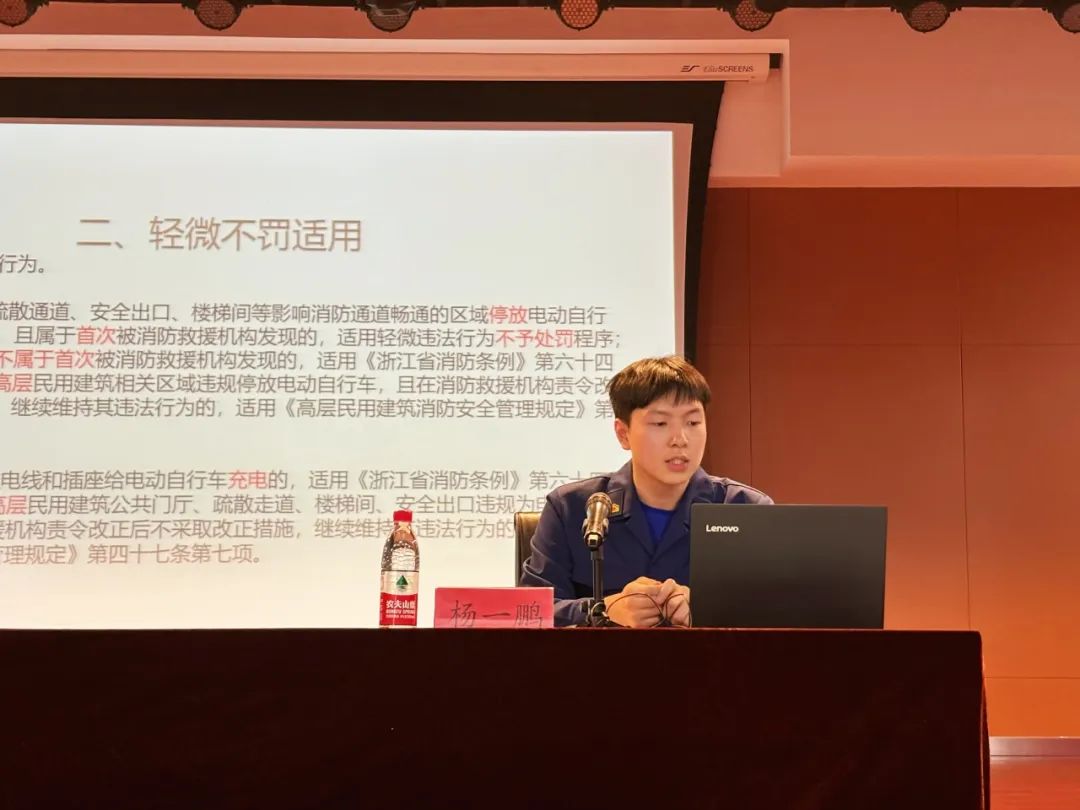 会上,拱墅区消防救援大队围绕消防安全工作和电动自行车管理开展集中培训。拱墅区电动自行车消防安全整治行动专班人员杨一鹏对《杭州市电动自行车消防安全管理办法》、《浙江省消防条例》、《高层民用建筑消防安全管理规定》中物业执法程序适用、电动车违法行为、物业企业管理职责、相关处罚等进行了深入解读。