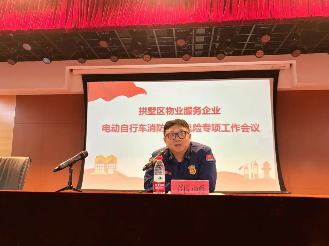 拱墅区消防安全委员会办公室副主任、区电动自行车综合整治专班整治推进组组长邵頔对全区电动自行车消防安全管理工作进行分析,通报了我区电动自行车智能充电点建设情况,指导和建议物业企业要从“堵”和”疏“二方面开展电动自行车安全管理工作,并就做好电动车消防安全风险专项整治行动提出劝导提醒、群众宣传、主动上报、平台录入等四点具体任务要求。