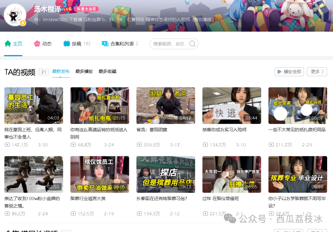 2024年1月6日,B站举办了第六届百大UP主盛典,其中00后入殓师汤木檀泽获得了“年度新人奖”,她用自己在行业中的所见所闻,成功以一己之力在B站提高了殡葬行业的话题度。