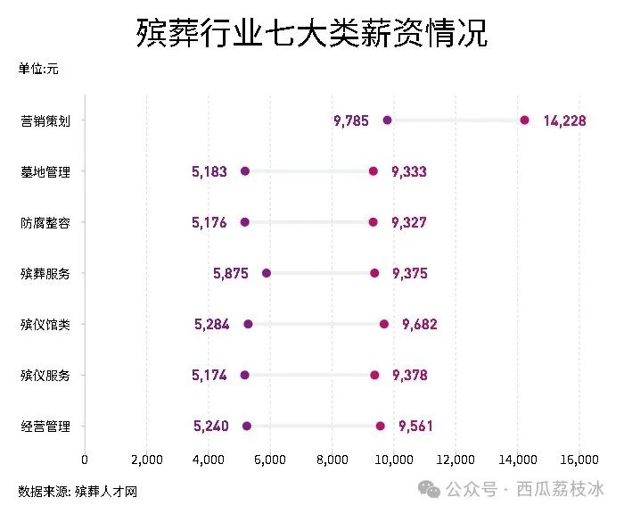 在殡葬人才官网的“找工作”一栏中,我们爬取了七类关于殡葬工作的薪资岗位情况,可以看到,每个岗位的薪资都有明显的差异,并没有达到完全的待遇好收入高的标准。