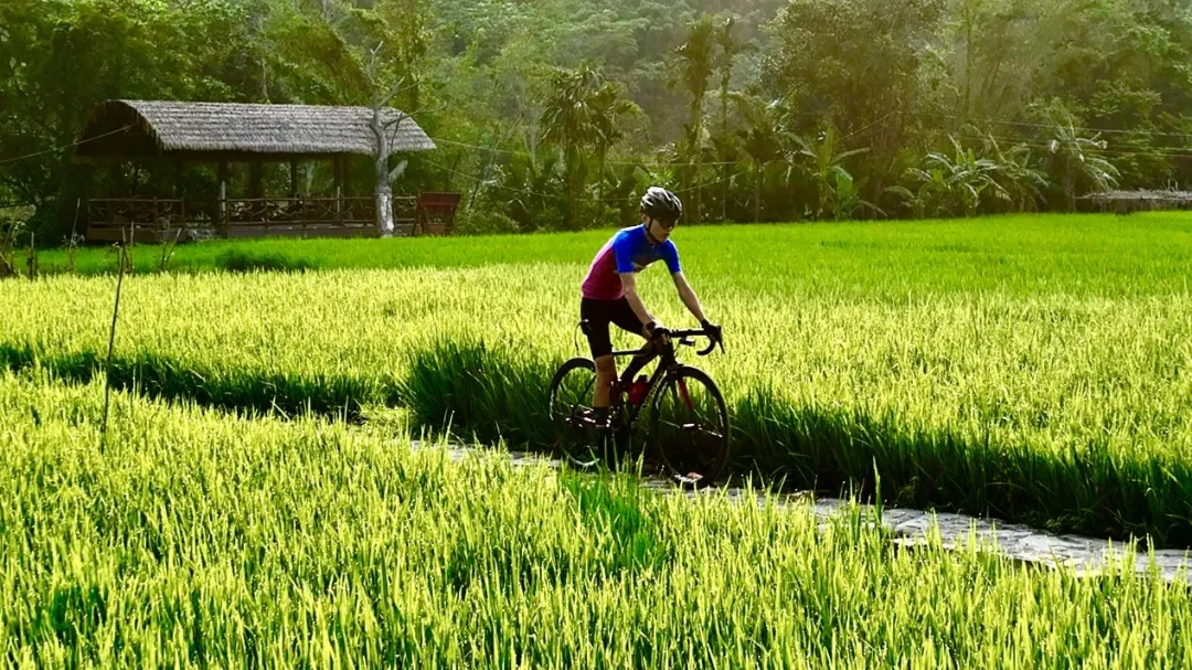 骑行者穿梭于诗意田园美景之中