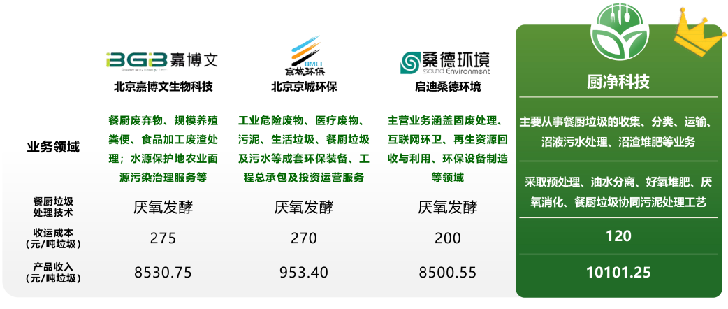 目前我国涉足餐厨垃圾处理的主要有普拉克环保系统(北京)有限公司、北京嘉博文生物科技有限公司等。通过对比发现,这些公司业务涉及医疗、农业、工业、城市固废等领域;餐厨垃圾的收运、分类和处理等环节;以厌氧发酵、微生物发酵、臭氧发酵及好氧堆肥单一处理技术为核心。具有涉及领域广、处理环节完善、技术单一的特征。而来自浙江进化的厨净科技公司专注于餐厨垃圾的处理,采用好氧堆肥与厌氧发酵结合的技术,资源化产品多,处理环节完善。