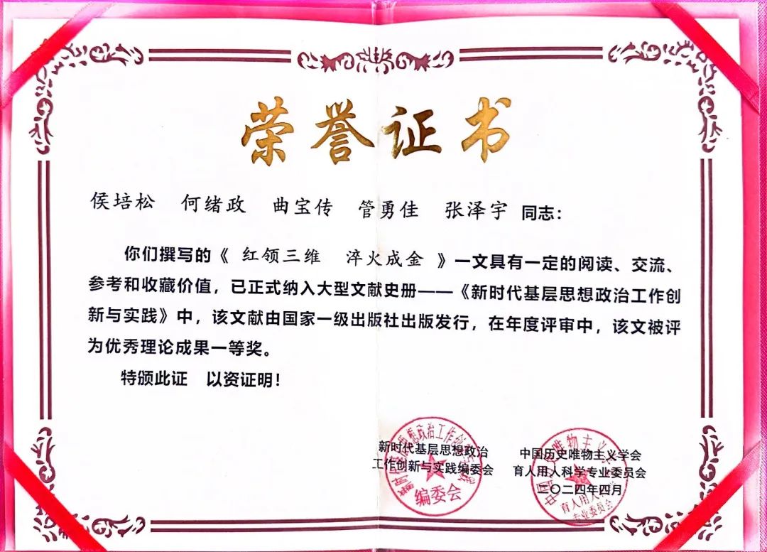 近日,山东三维控股集团党支部党建理论成果《红领三维 淬火成金》一文被收录到由中国红色文化研究会主办的、中共中央党校出版社出版的《新时代思想政治工作创新与实践》一书中,并被评为“优秀理论成果一等奖”。