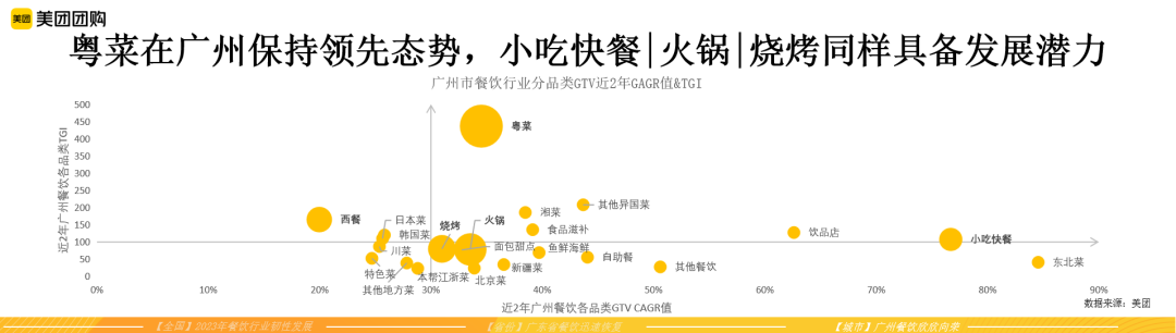从2023年广州餐饮数据来看,“小吃快餐”类门店数量居于首位;餐饮消费热度集中于粤菜、火锅、小吃快餐、饮品四大品类,其中粤菜在广州持续保持领先态势;食品滋补、异国菜、新疆菜、湘菜等品类热度也逐渐走高,具备发展红利。