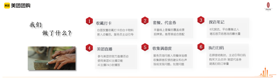 商家可以借助美团升级的货架、直播IP,覆盖更多消费场景,提升曝光吸引流量;通过特价团购和美团圈圈构建新的营销场,以创新渠道提升销量;通过达人笔记打造“广州粤菜地图”,沉淀口碑;以线下扫码等方式打通流量,持续沉淀线上数字资产;最终通过矩阵整合营销实现长效经营。