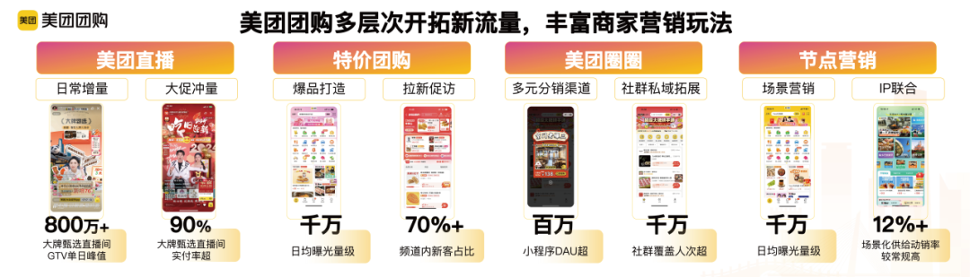 商家要积极用好美团的产品和服务,通过“引流品+主力品+利润品”三层营销布局进行精细化运营,实现拓新客、促销量,打造品质好店。也可以借助美团直播开辟新场域,用特价团购撬动千万流量、强化囤货心智,通过美团圈圈拓展流量、快速爆单,用好美团神会员、做好节点营销,最终实现确定的生意增长。
