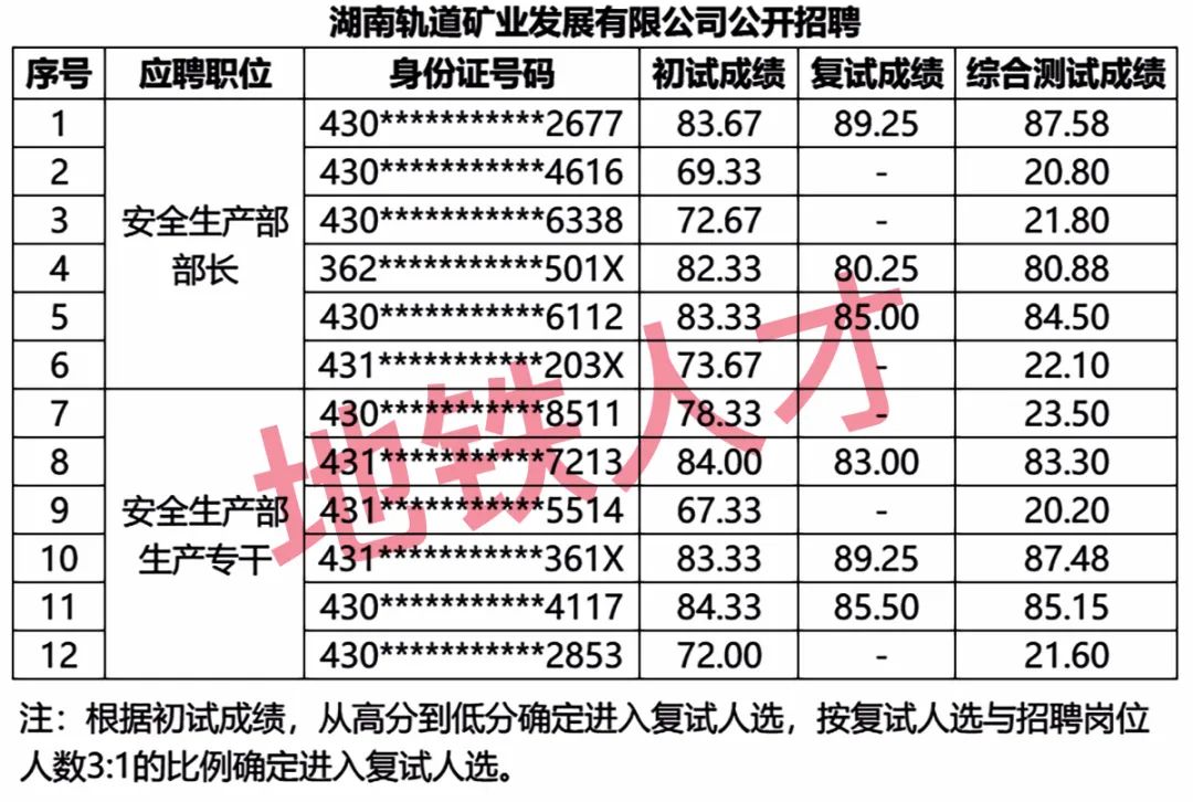 1、湖南轨道矿业发展有限公司公开招聘初试、复试及综合测试成绩公告