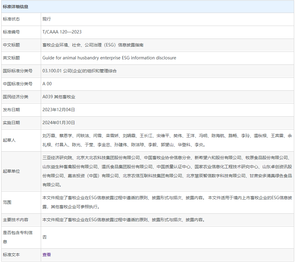 由中国畜牧业协会归口、三亚经济研究院和北京大北农科技集团股份有限公司牵头起草的团体标准——《畜牧企业环境、社会、公司治理(ESG)信息披露指南》(T/CAAA 120—2023)于2023年12月4日发布,并于2024年1月30日开始实施。本标准是首个针对畜牧行业ESG信息披露的团体标准,旨在为畜牧企业规范披露ESG相关信息提供指引,进而引导畜牧企业可持续发展。