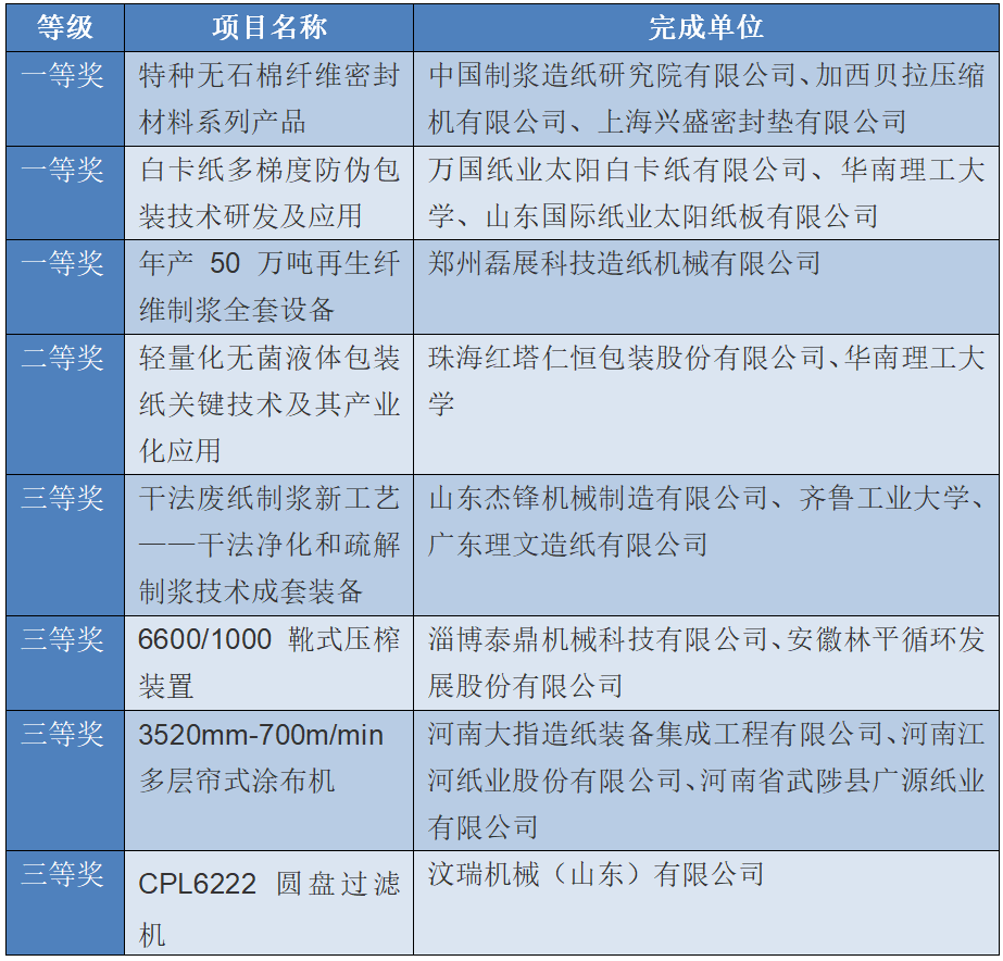 造纸行业共有8项成果获2023年度中国轻工业联合会科技进步奖,一等奖3项,二等奖1项,三等奖4项。其中,我会常务理事单位珠海红塔仁恒包装股份有限公司与华南理工大学的共同研发的项目“轻量化无菌液体包装纸关键技术及其产业化应用”入围二等奖。具体见表1。