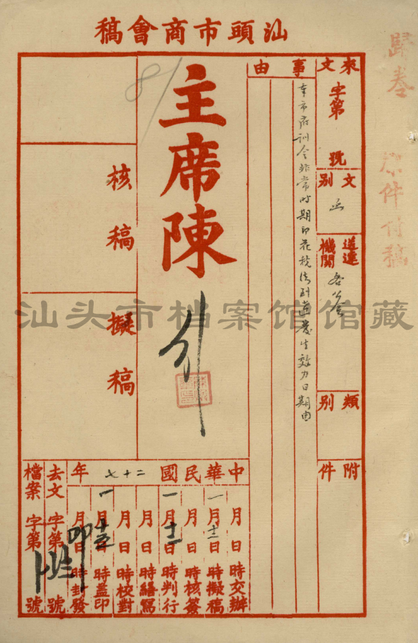 馆藏民国汕头市商会档案起止年代为1912-1949年,共949卷。该全宗检索工具有案卷级、文件级电子目录和案卷级、文件级纸质目录,已完成全文数字化。