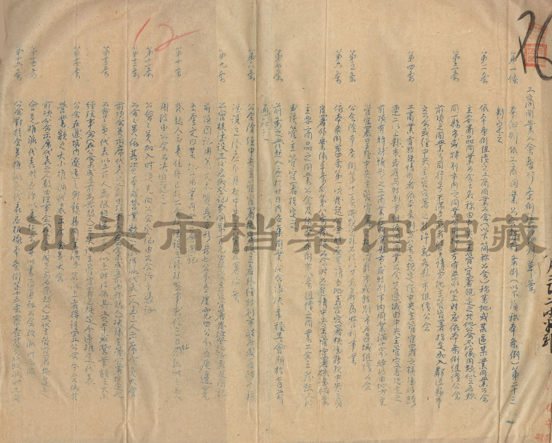 1.市商会选举理监事和当选人、会员名册,理监事暨各业公会联席会议及各专门委员会会议等会议记录,有关处理行政事务、经费预算和人事任免等文书材料;有关本市各行业同业公会、社团组织成立、组织章程、会员名册、选举理监事、会议记录及劳资纠纷、工人抗议、罢工等文书材料。