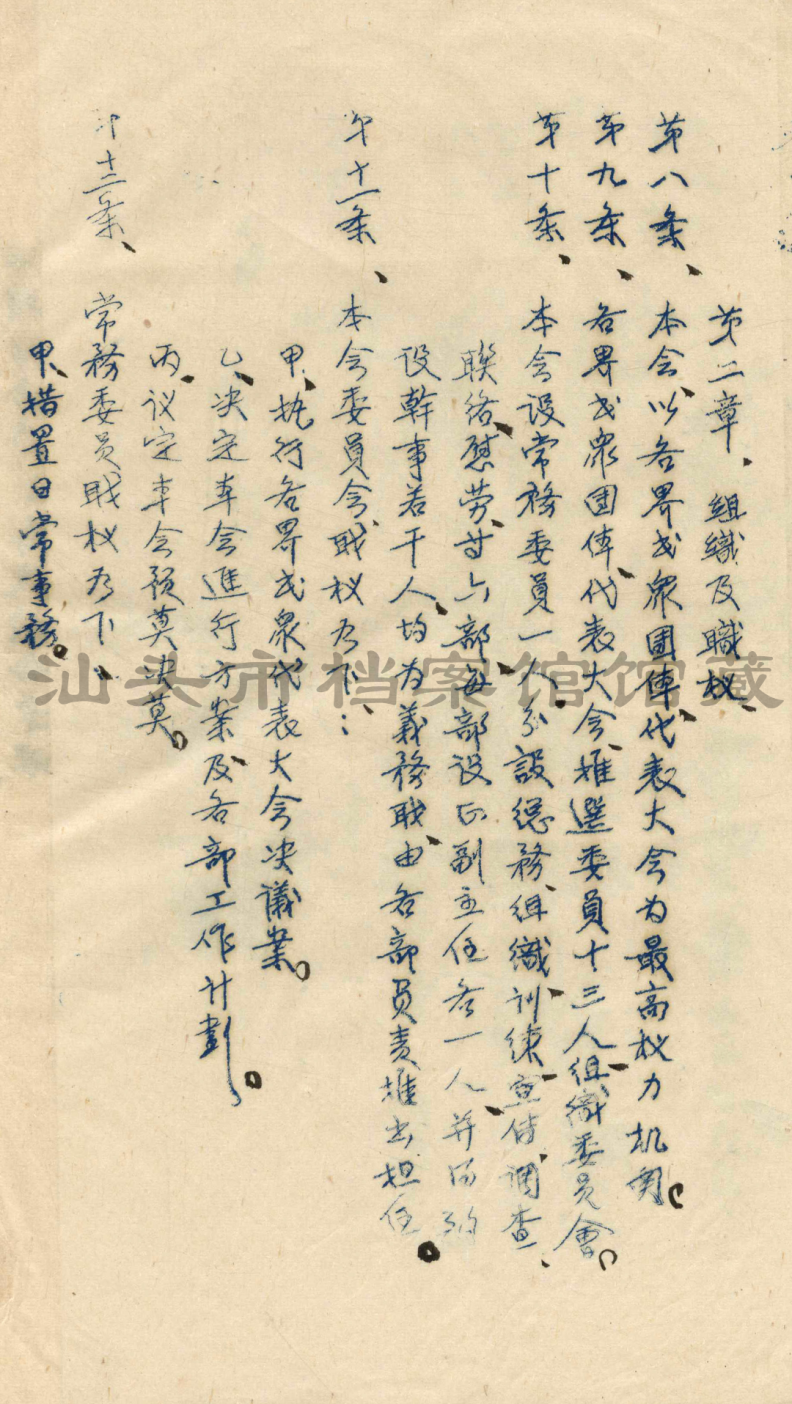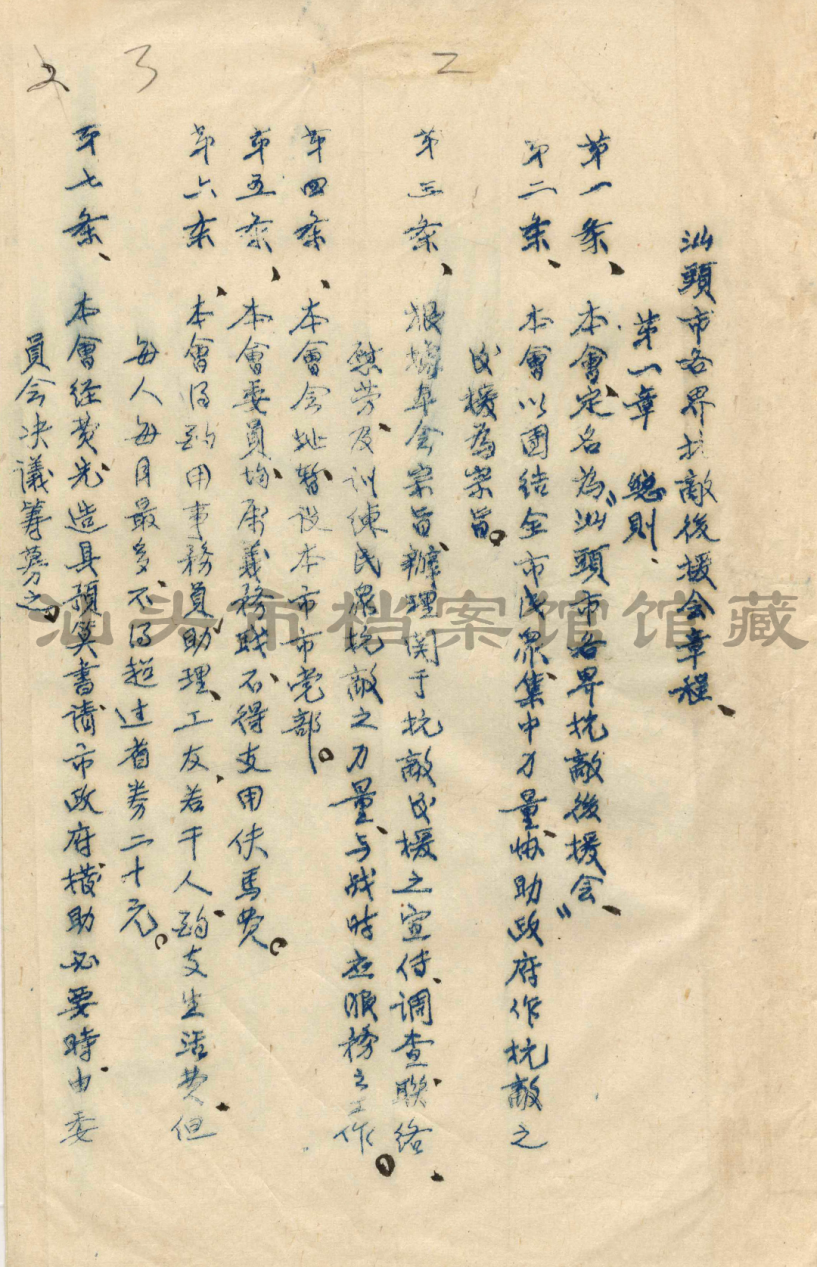 4.有关防私委员会、汕头市各界抗敌后援会组织及文书材料,1925年国民外交后援会及省港罢工委员会有关材料,有关潮梅各地水旱风灾情况调查及国内外慰问、筹赈等文书材料,市商会与国内各地商会及国外同业公会来往文书;有关抽检中山公园的各种会议记录,工程、文书材料和汕头市开埠以来商业经济贸易发展概况、工商企业社团金融概况调查统计等材料。