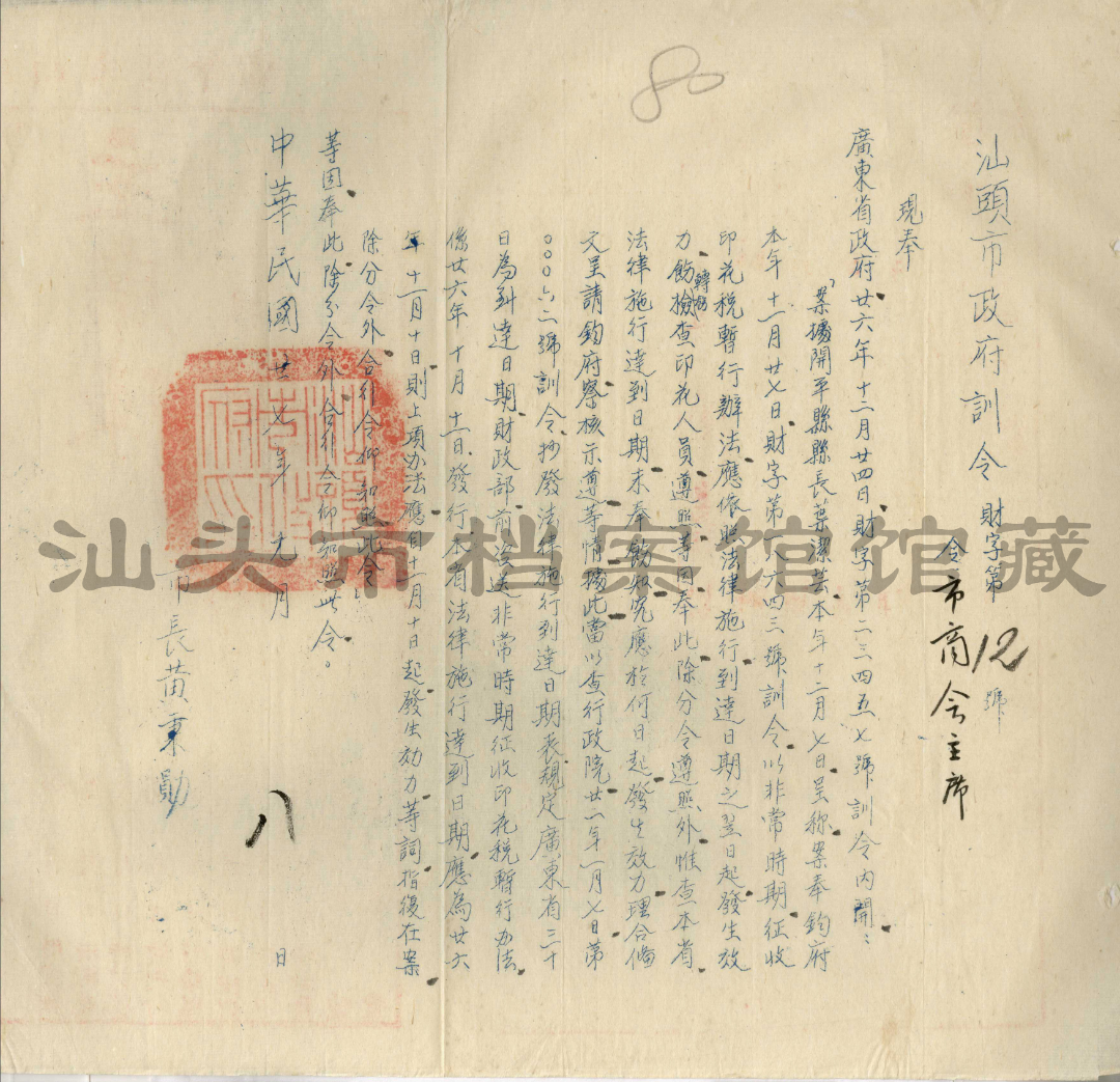 汕头市政府关于非常时期印花税法到达发生效力日期致市商会主席的训令