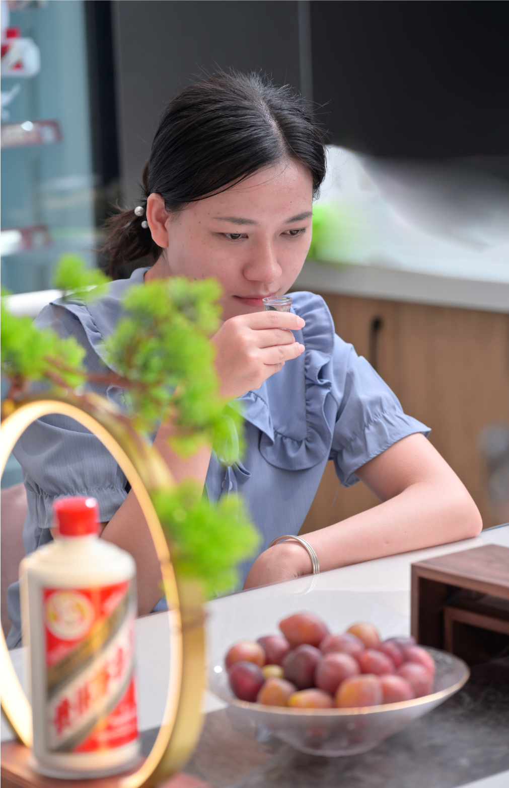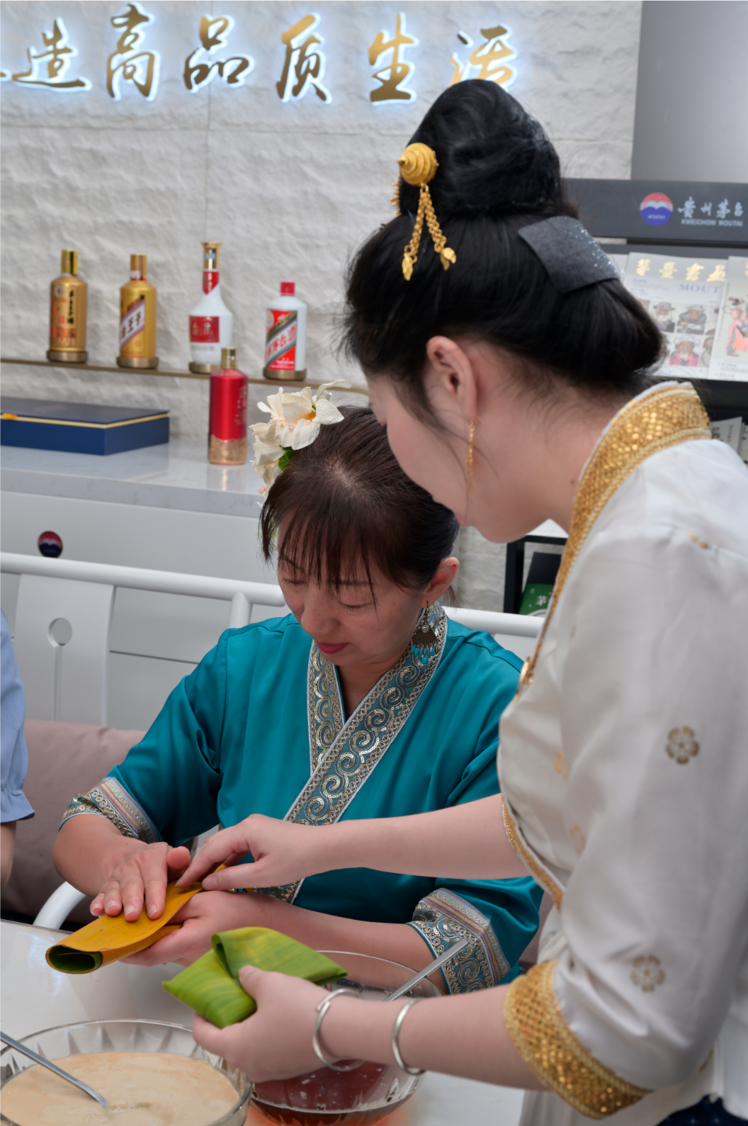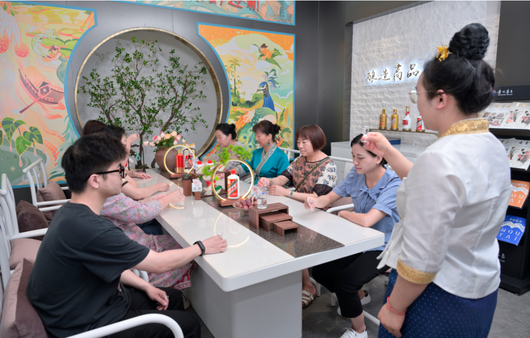 专卖店工作人员为嘉宾讲解茅台酒的酿造工艺和品鉴技巧来感受茅台酒的味蕾之旅。