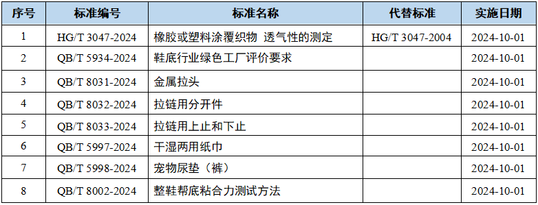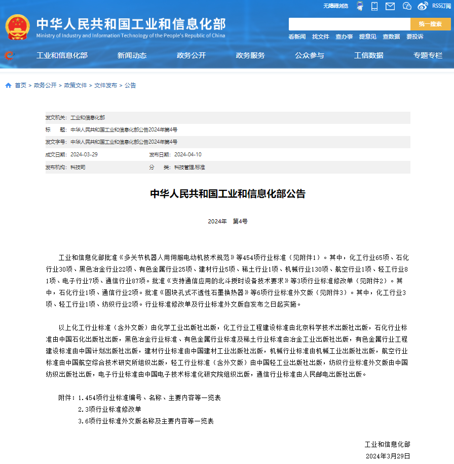 近日,工业和信息化部批准发布了2024年第4号公告,批准《多关节机器人用伺服电动机技术规范》等454项行业标准、批准《圆块孔式不透性石墨换热器》等6项行业标准外文版,其中纺织鞋服相关标准如下,敬请各企业留意标准动态,合理安排生产和研发创新技术,以便更好的控制产品质量。