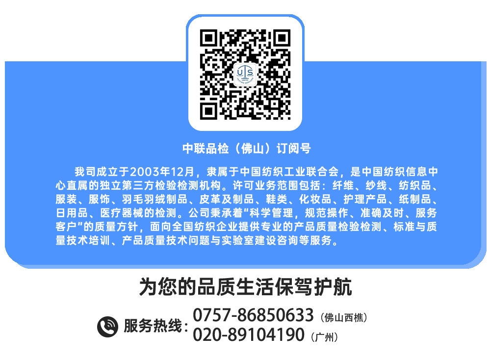 中联品检(佛山)公司拥有专业的技术团队, 为纺织服装企业保驾护航,提供质量控制。为您跟踪国家标准、行业标准的最新动态,欢迎随时联系我们。