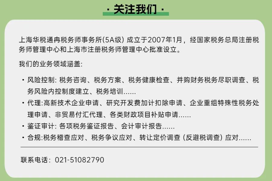 上海华税通冉税务师事务所将继续秉持高效、诚信、专业的服务理念,通过线上讲座、专题培训等多种形式,持续为广大企业提供前沿的税务资讯与定制化的解决方案。敬请关注我们的官方网站、微信公众号及社交媒体平台,获取最新的活动信息与行业动态。